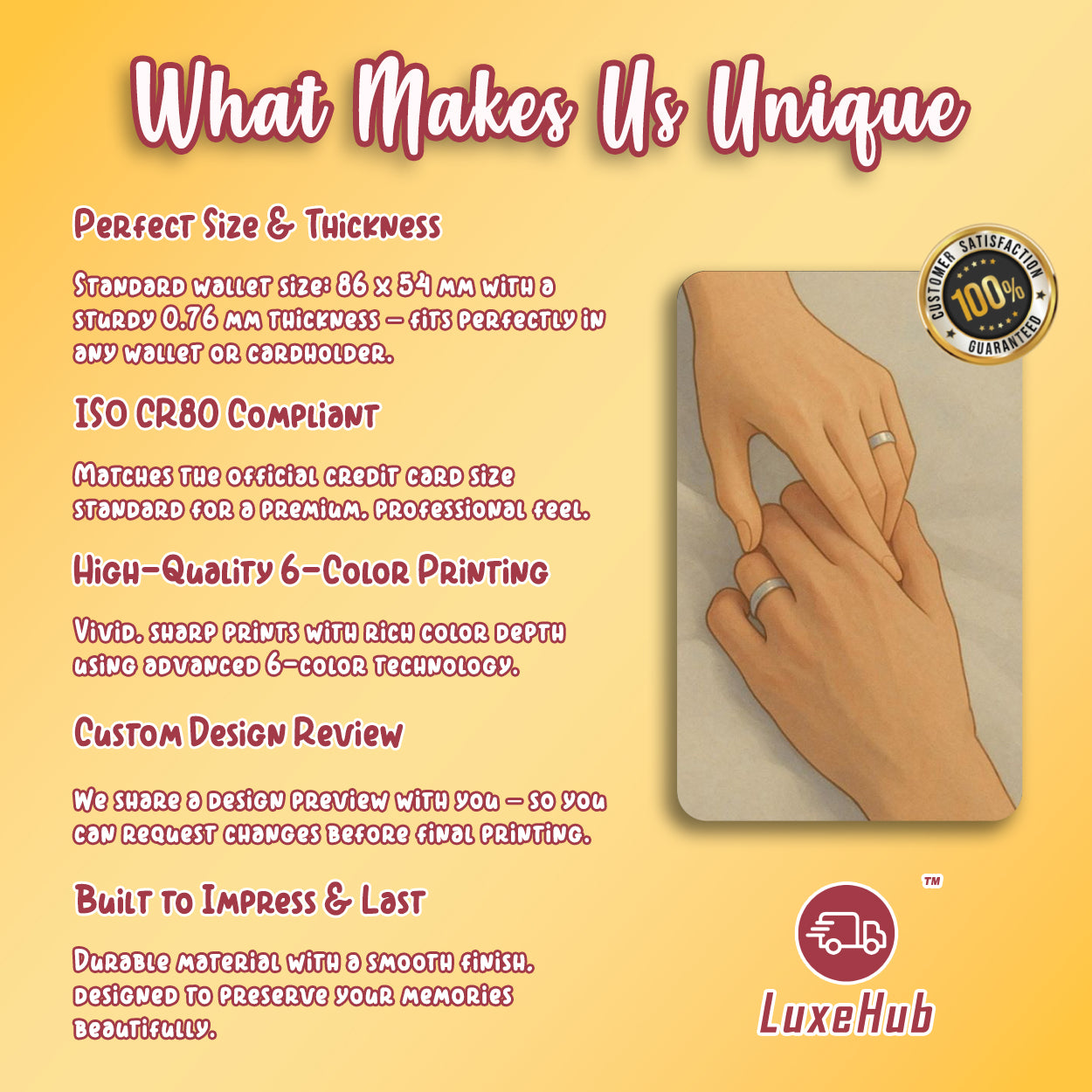 Perfectly sized at 8.6 × 5.4 cm, it slips seamlessly into any wallet while carrying the emotional touch of your story.